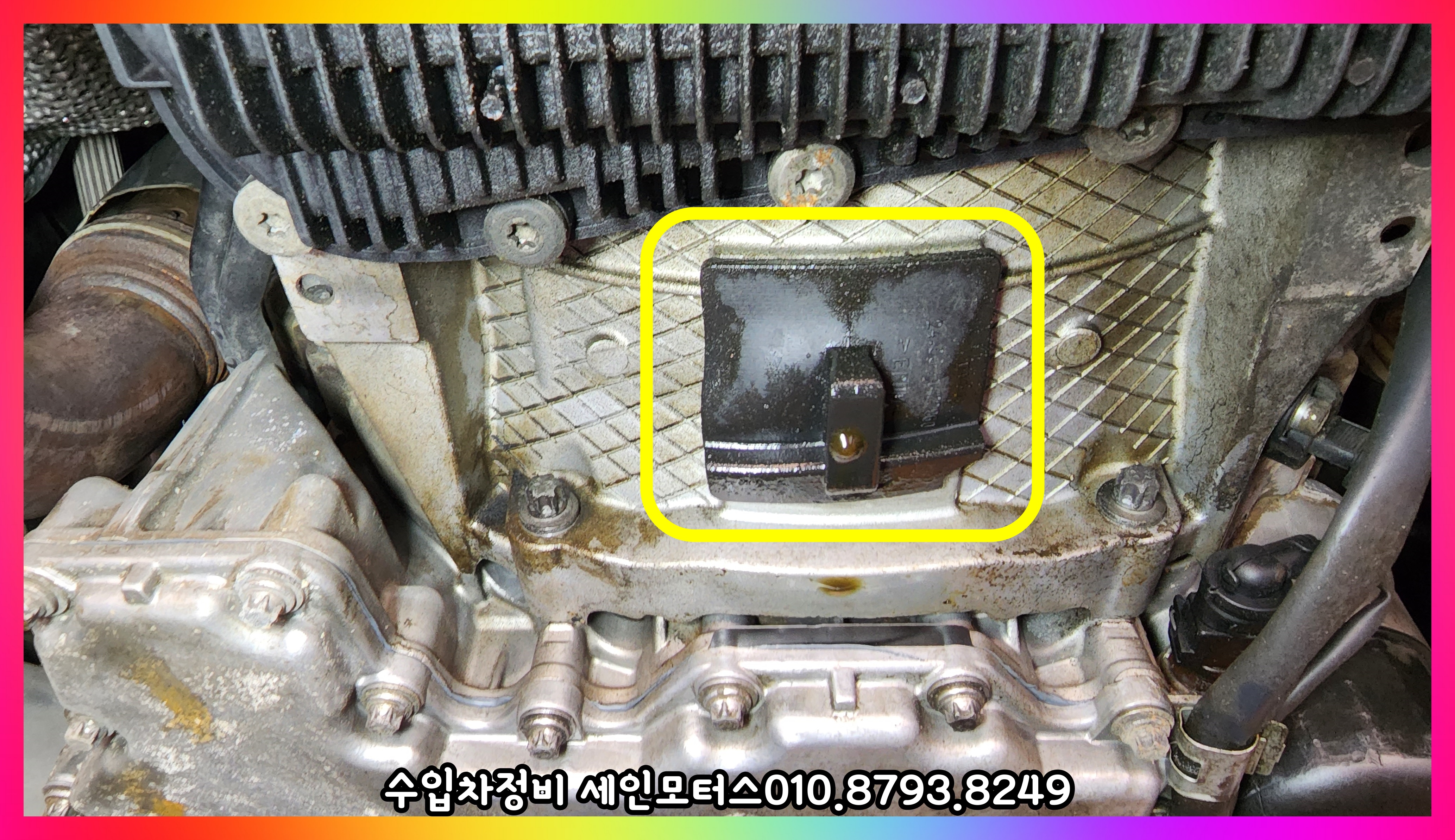 엔진과 미션 중간 부분에서 오일이 줄줄 흐른다.